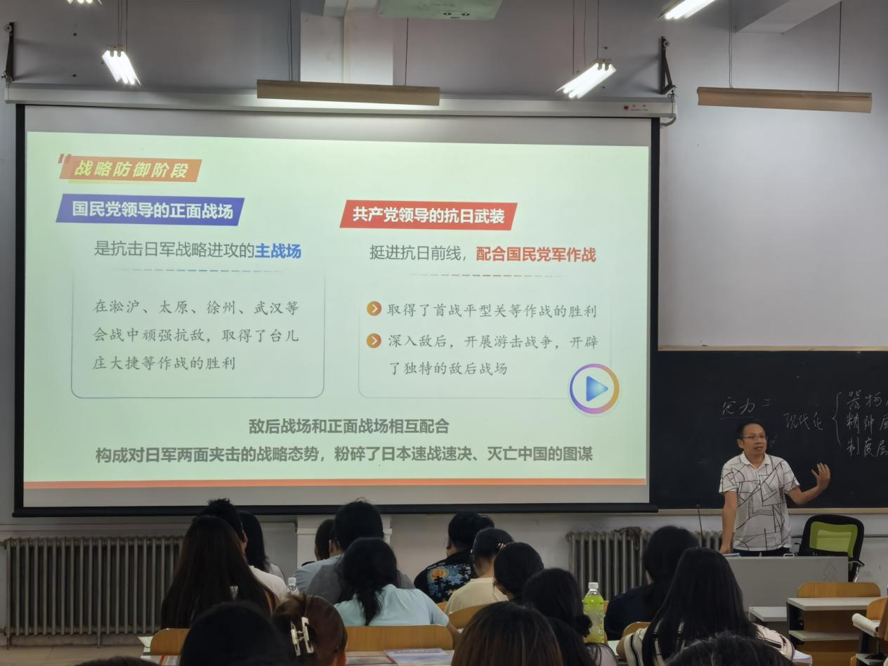 为深入贯彻落实习近平总书记在纪念中国人民抗日战争暨世界反法西斯战争胜利80周年大会上的重要讲话精神,扎实推进习近平总书记重要讲话精神进教材、进课堂、进头脑,马克思主义学院以提高思政育人质量为主线,围绕“弘扬伟大抗战精神 勇担民族复兴大任”主题,紧扣教学主渠道,精心组织开展了“理论铸魂”“课堂浸润”“集智备课”“光影课堂”等系列活动。